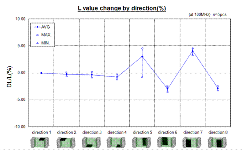 可以看出,标记点朝侧面,感值变化较大,所以贴片时应注意让电感上的标记点朝上。